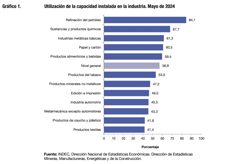 Los bloques sectoriales que presentan niveles de utilización de la capacidad instalada superiores al nivel general son refinación del petróleo (84,1%), sustancias y productos químicos (67,7%), industrias metálicas básicas (61,3%), papel y cartón (60,5%) y productos alimenticios y bebidas (59,4%). Los bloques sectoriales que se ubican debajo del nivel general son productos del tabaco (53,0%), productos minerales no metálicos (47,2%), edición e impresión (46,0%), industria automotriz (45,5%), metalmecánica excepto automotores (45,3%), productos de caucho y plástico (41,6%) y productos textiles (41,4%).