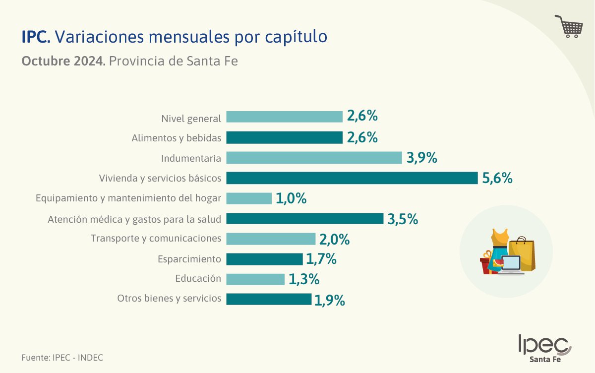 En el mes de octubre de 2024, la provincia de Santa Fe registró un incremento en el Índice de Precios al Consumidor (IPC) del 2,6% respecto al mes anterior. De esta manera, el guarismo registrado es similar al informado por el INDEC a nivel nacional (2,7%), siendo el más bajo de los últimos tres años.