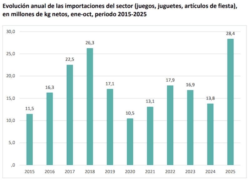 Si se incluyen juegos de mesa, artículos de aire libre y artículos de fiesta, el volumen total asciende a 28,4 millones de kilos. Con estos niveles, 2025 se perfila como el año de mayor ingreso de productos en dos décadas, incluso por encima del pico de 2018, pero con una diferencia crítica: el consumo está cayendo.