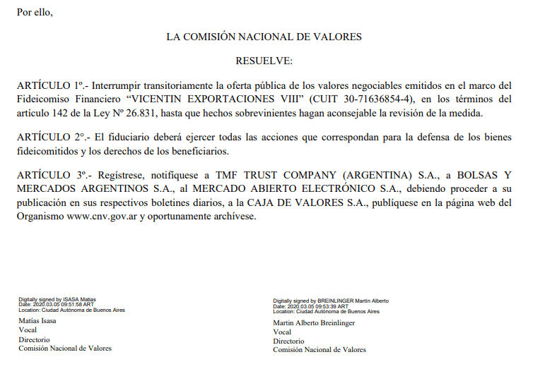 Es entonces que la Comisión Nacional de Valores (CNV) resolvió interrumpir transitoriamente la oferta pública de los valores negociables emitidos en el marco del Fideicomiso Financiero “Vicentín Exportaciones VIII”, hasta que "hechos sobrevinientes hagan aconsejable la revisión de la medida".