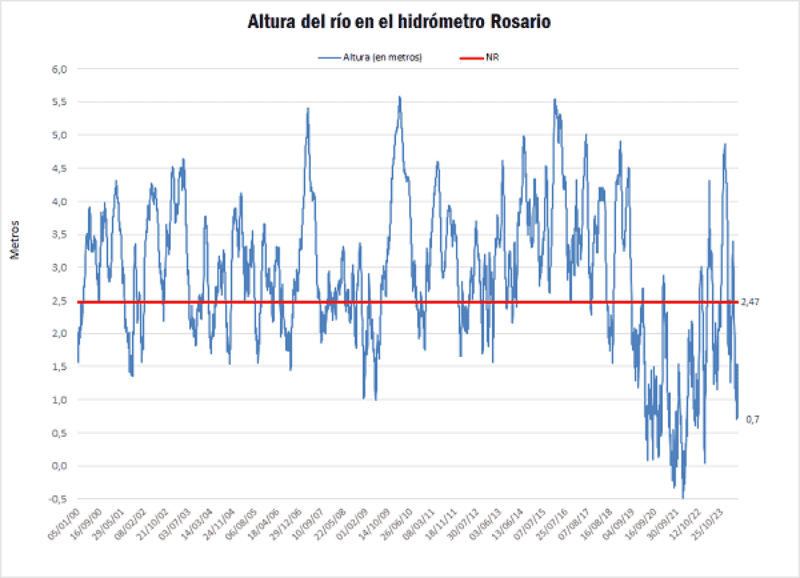 Las proyecciones de altura de agua, según información del Instituto Nacional del Agua (INA), no son alentadoras. El nivel del Río Paraná en el hidrómetro Rosario el 7/08 fue de 0.73 m por encima del cero local, lo que significa que se encuentra 1,74 m por debajo de la marca de 2,47 m considerado nivel estándar de referencia.