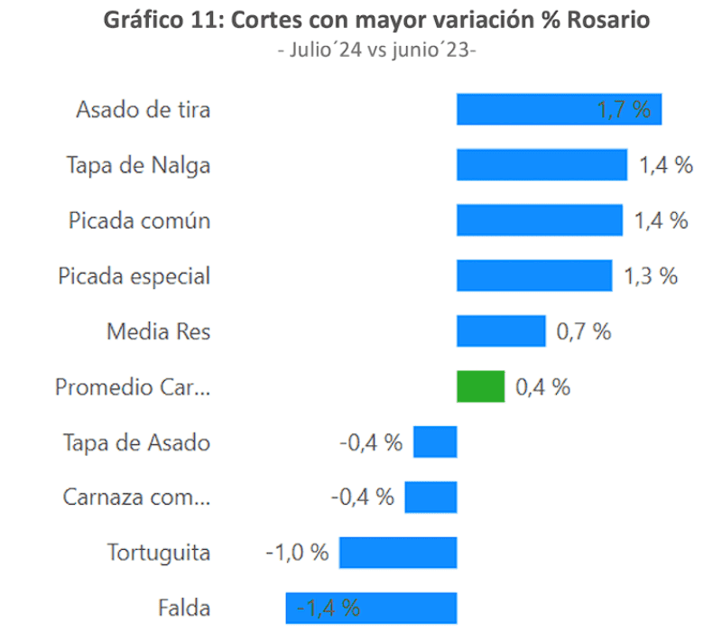 Las mayores subas de precios en julio en esta plaza se dieron en el asado (1,7%), la picada común y la tapa de nagla (1,4%) y la picada especial (1,3%). En cambio, los que bajaron su precio fueron la falda (-1,4%), la tortuguita (-1%) y la carnaza común y tapa de asado (-0,4%).