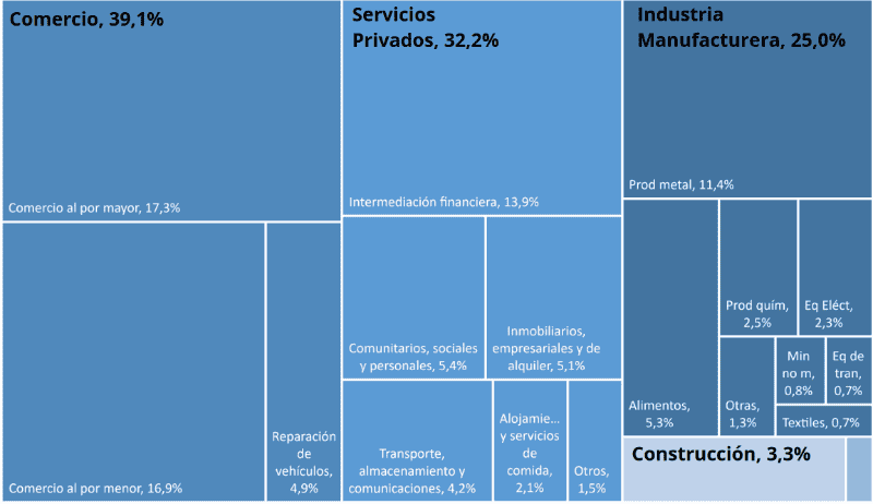 Respecto de la participación de los sectores económicos en la facturación total correspondiente al mes de septiembre 2023, se destacan: comercio con un 39,1%; servicios privados 32,2% e industria manufacturera 25%. En sentido opuesto, con menor participación aparece textiles con un 0,7%.