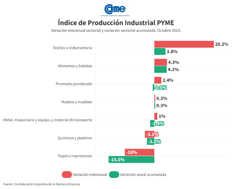 Durante octubre, la actividad manufacturera de las pequeñas y medianas empresas experimentó un aumento del 2,4% en comparación con el mismo período del año anterior, marcando el fin de una serie de cuatro meses consecutivos de descensos, según la Confederación Argentina de la Mediana Empresa (CAME).