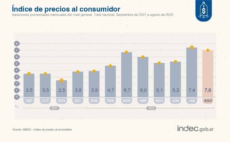 La inflación sigue caliente en Argentina y trepó hasta el 7%, aunque desaceleró respecto de julio, cuando tocó el nivel más alto en 20 años (7,4%), es la segunda cifra más alta en lo que va del año, incluso posicionándose por encima de las estimaciones de consultoras que auguraban números en torno al 6,5%.