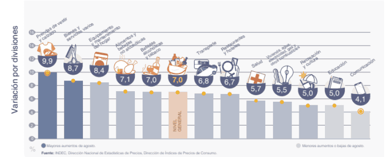 Durante agosto, también se destacó la suba de la cuota de la medicina prepaga, que incidió en la división Salud (5,7%); de los servicios de agua y electricidad en algunas regiones del país, que impactó en Vivienda, agua, electricidad, gas y otros combustibles (5,5%); y de los servicios de telefonía móvil en la mayoría de las regiones, que se vio reflejada en Comunicación (4,1%).