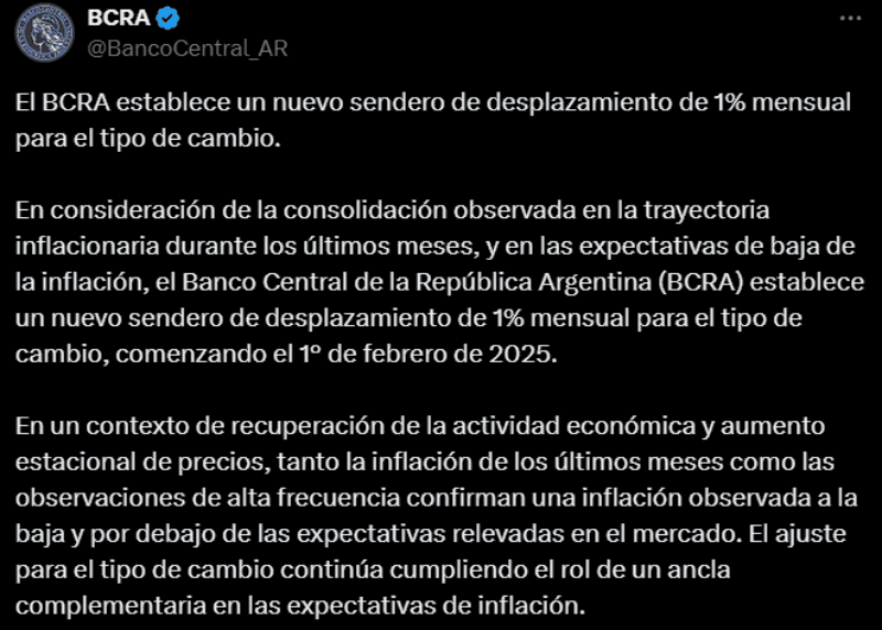 "En consideración de la consolidación observada en la trayectoria inflacionaria durante los últimos meses, y en las expectativas de baja de la inflación, el Banco Central de la República Argentina (BCRA) establece un nuevo sendero de desplazamiento de 1% mensual para el tipo de cambio, comenzando el 1° de febrero de 2025", indicó la institucion monetaria en un comunicado difundido por la red social "X".