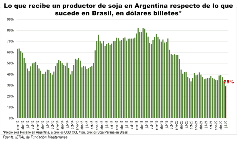 El experto remarcó que al observar lo que pasa en otros países, un productor con el mismo producto y destino, recibe prácticamente el 100% del valor de su grano. “Al ampliarse la brecha cambiaria se profundiza el castigo sobre el sector exportador. En el caso de la soja que paga 33% de DEX (retenciones), un productor de Argentina cobra en dólares billete el 29% de lo que recibe un productor de Brasil”, explicó. Y agregó: “se trata del porcentaje más bajo desde que hay cepo”