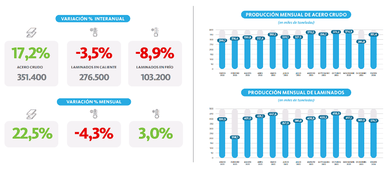 La industria siderúrgica argentina comenzó 2026 con señales mixtas. De acuerdo con el informe mensual de la Cámara Argentina del Acero (CAA), la producción de acero crudo en enero alcanzó las 351.400 toneladas, lo que representa un crecimiento del 22,5% respecto de diciembre de 2025 y una mejora del 17,2% frente a igual mes del año pasado.