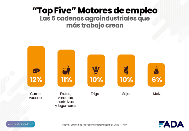 _ Top 5 cadenas que más empleo generan: 12,4% carne vacuna, 11% Frutas, verduras, hortalizas y legumbres, 9,6% soja, 9,5% trigo, 6,4% maíz.