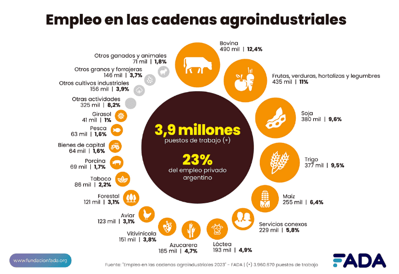 El dato surge del informe Empleo en las Cadenas Agroindustriales que actualiza la Fundación Agropecuaria para el Desarrollo de Argentina (FADA). “3.960.670 de puestos de trabajo los generan las cadenas agroindustriales, podrían ser más puestos todavía”, agrega Nicolle Pisani Claro, economista de FADA, “con 4 cambios claves nuestro país podría generar medio millón de nuevos empleos, lo que es equivalente a un tercio del total de desocupados en Argentina”.