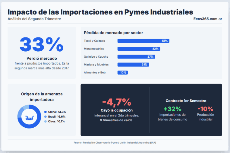 El 33% de las pequeñas y medianas empresas (pymes) industriales perdió mercado a manos de productos importados durante el segundo trimestre con relación al período anterior, según revela el ultimo reporte de la Fundación Observatorio Pyme.
