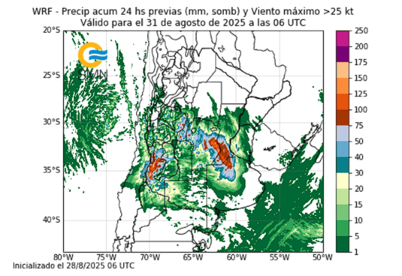Durante todo el período se esperan valores de precipitación acumulada que oscilarán entre los 20 y los 120 milímetros, aunque en algunos sectores podrán registrarse lluvias más abundantes, entre 120 y 150 milímetros, e incluso superiores. A la fecha existe incertidumbre en torno a la localización exacta de los acumulados más importantes, pero la mayoría de los modelos de pronóstico numérico coinciden en que podrían concentrarse sobre Mendoza, San Luis, el sur de La Rioja, el centro y sur de Córdoba, el norte de La Pampa, el sur de Santa Fe y el norte y oeste de Buenos Aires.
