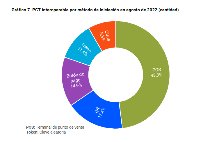 Los PCT interoperables iniciados por QR representaron el 17,4% de los PCT, mientras que los iniciados en POS con credenciales de tarjeta fueron el 48%. En tanto, los iniciados con claves aleatorias aportaron el 11,4% y los iniciados con botón de pago, el 14,9%.