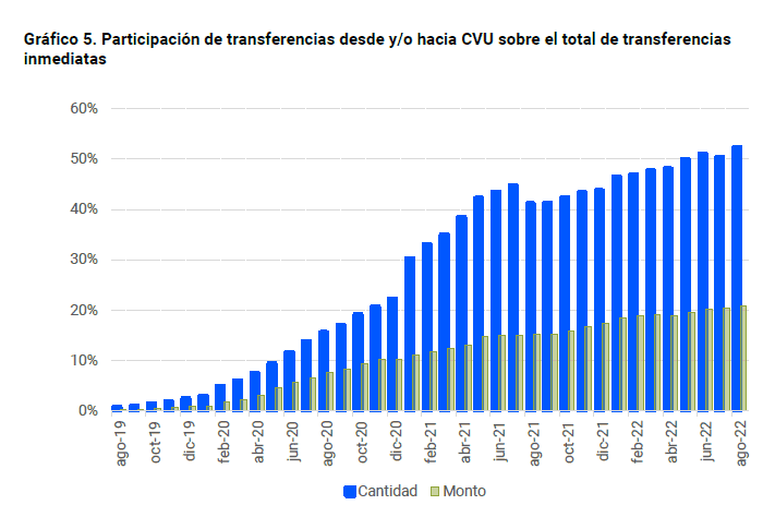 Otra información relevante que surge de esta nueva publicación del BCRA es que en el 52,3% de las operaciones de transferencias inmediatas participó, como origen y/o destinatario, una Clave Virtual Uniforme (CVU). Durante agosto se efectuaron 145,6 millones de transferencias inmediatas por $ 3,5 billones, que implican crecimientos interanuales del 105,6% y del 29,7%, en cantidades y en montos respectivamente.