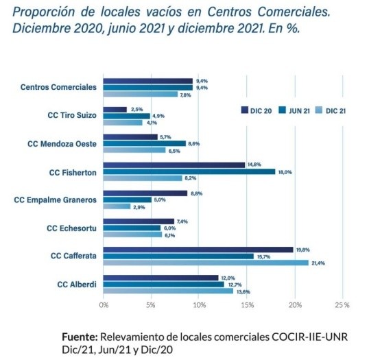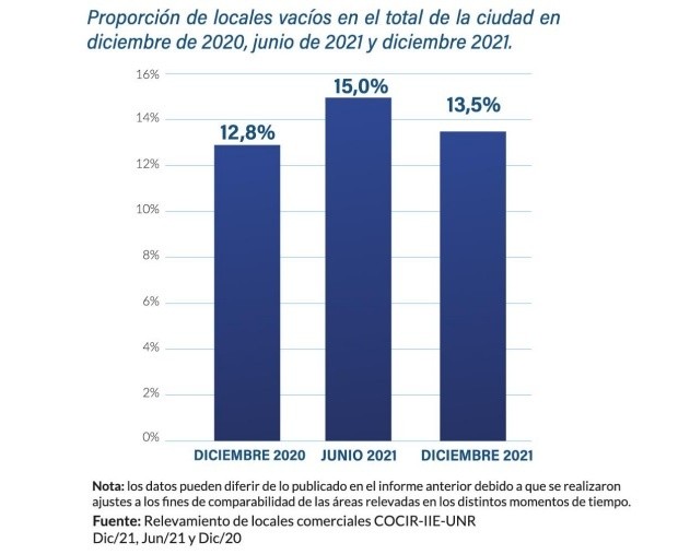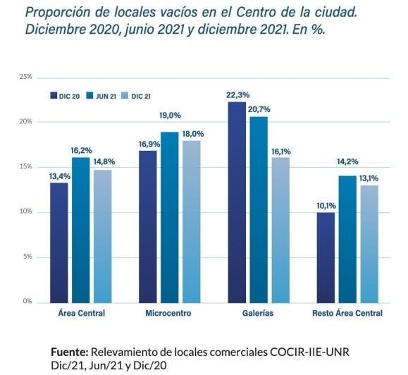 La cantidad de espacios vacíos en diciembre de 2020 era de 12,8%, pero subió a 15% en junio 2021, y bajó a 13,5% en diciembre 2021. En el desagregado se indica que el área central cuenta con un 14,8% de locales vacíos, el resto del área central 13,1%, galerías 16,1% y microcentro 18%, siendo todavía esta última la zona más afectada.