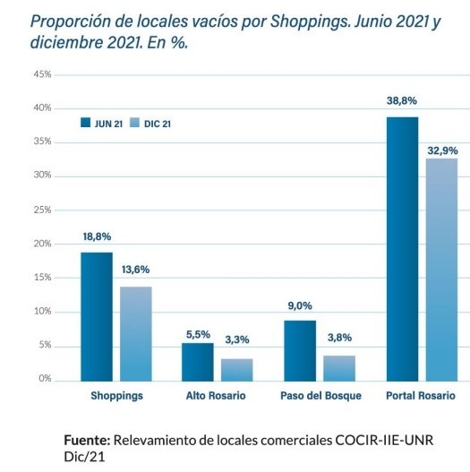 En cuanto a los shoppings, el promedio de desocupación en diciembre de 2021 es de 13,6%, contra 18,8% de junio de este año. El mejor posicionado es el Alto Rosario con 3,3% de vacancia, seguido por Paso del Bosque con 3,8%. El Portal Rosario mejoró su situación, que sin embargo sigue siendo preocupante con un 32,9% de los locales libres.