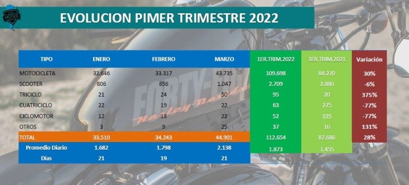 Con un total de 393.059 patentamientos, y una suba interanual del 49,5%, el 2021 fue positivo para el mercado de motos. Pero este año pinta para ser bastante mejor. Sólo en marzo se vendieron 44.901, alcanzando en el primer trimestre las 112.654, un 28,5% más que en el mismo periodo del año pasado, y un promedio de 1.250 unidades por día. Santa Fe es la segunda provincia del país con más comercializaciones al respecto, y las expectativas para lo que resta del año son muy favorables. A contrapelo, cayó casi 9% la venta de autos en el primer trimestre.