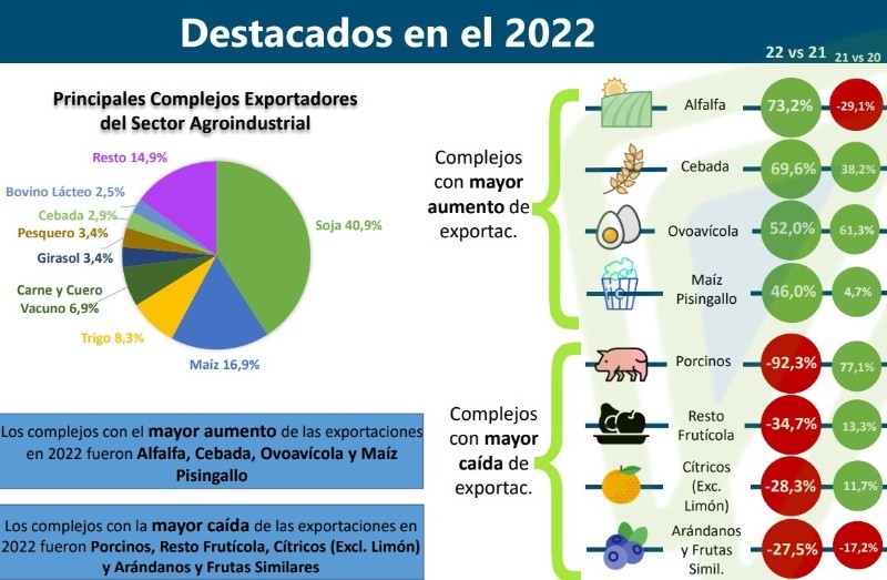 Las cadenas de valor con mayor aumento interanual en sus exportaciones fueron alfalfa (73,2%); cebada (69,6%) y ovoavícola, con 52%. En la vereda opuesta, el comercio exterior del sector porcino cayó un 92,3%, seguido por el resto frutícola (34,7% y cítricos (excluido limón), con 28,3%.
