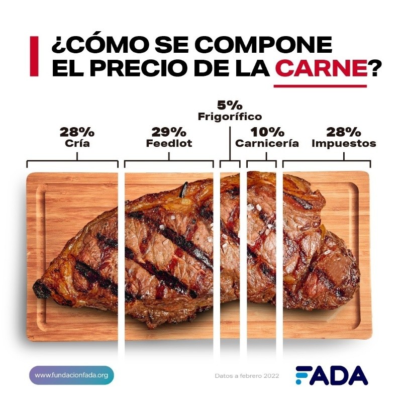 Se registra que en el precio promedio de la carne la cría representa el 28%, el feedlot 29%, frigorífico 5%, carnicería el 10% y los impuestos el 28%. El maíz representa 11% del precio del kilo de carne al mostrador.