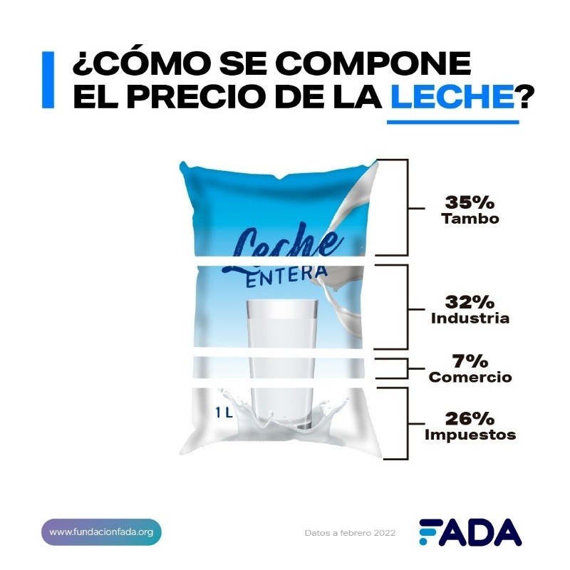 El trabajo arroja que, en el precio del sachet de leche entera, el tambo representa el 35%, la industria el 32%, el comercio 7% e impuestos el 26%. “Para decirlo de otra forma, en promedio el sachet tuvo un precio de $106,5, de los cuales $28 son impuestos”, explica Ariño. El maíz constituye el 18% del precio de la leche cruda (tambo) y el 6% del sachet.