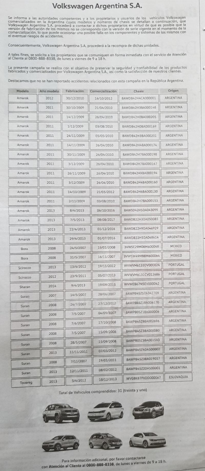 La marca no dio detalles acerca de cuál es el desperfecto específico pero dio a conocer el año, fecha de fabricación, de venta y numero de chasis de los autos buscados. Las unidades corresponden a modelos de Amarok y Suran (ambos de fabricación nacional) y Bora, Touareg, Sharan y Scirocco (importados).