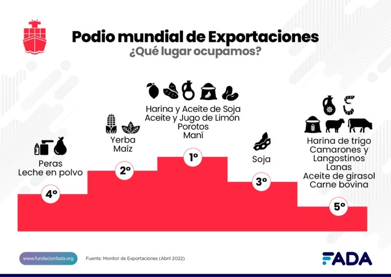 Argentina es el primer exportador mundial de harina y aceite de soja, aceite y jugo de limón, porotos y maní. Estamos segundos con maíz y yerba, terceros con soja, cuartos con las peras y la leche en polvo y ocupamos el quinto puesto con harina de trigo, camarones y langostinos, lanas, aceite de girasol y carne bovina.