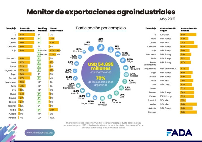 El Monitor de Exportaciones Agroindustriales es un estudio semestral que realiza la Fundación Agropecuaria para el Desarrollo de Argentina de (FADA) para exhibir el potencial de los complejos agroindustriales exportadores. Se trata de una herramienta que mide la participación de las exportaciones agro en el total de las exportaciones del país y hace foco en 20 cadenas agroindustriales. Sobre estas cadenas se analizan indicadores de aporte de divisas, derechos de exportación, inserción internacional, ranking a nivel mundial, share de mercado, concentración de destinos y concentración de origen regional.