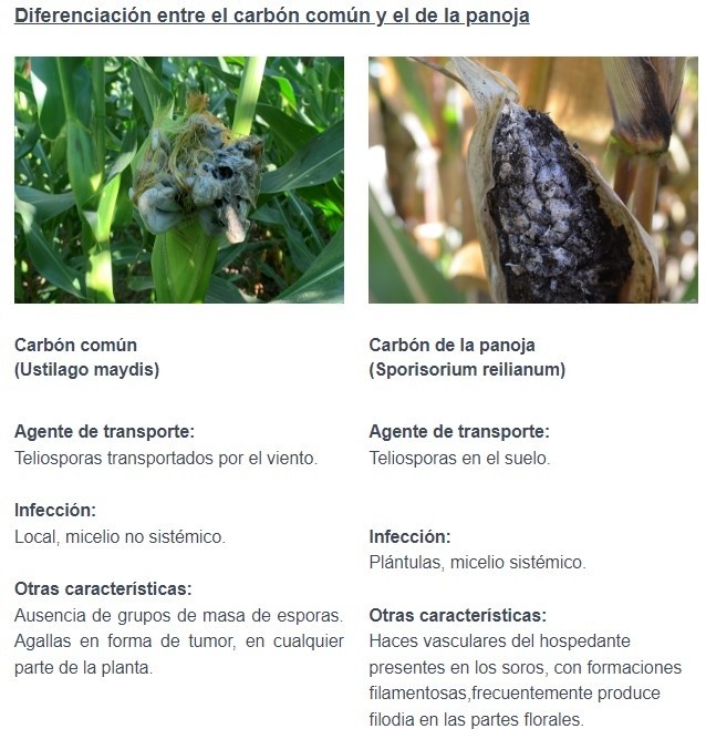 En maíz pueden generarse dos enfermedades denominadas comúnmente como carbón: el “carbón común del maíz”, causado por Ustilago maydis, que se encuentra campaña tras campaña en todas las regiones de Argentina y el “carbón de la panoja del maíz”, causado por Sporisorium reilianum f. sp. zeae.