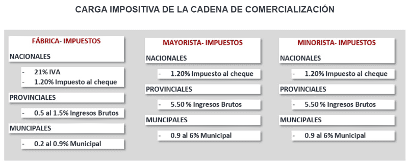 Según el estudio realizado por la Cámara Argentina de Distribuidores y Autoservicios Mayoristas (CADAM), acerca de la carga impositiva en la cadena de comercialización de productos de primera necesidad, entre impuestos nacionales, provinciales y municipales, casi la mitad de un producto de consumo masivo de primera necesidad se va en impuestos.