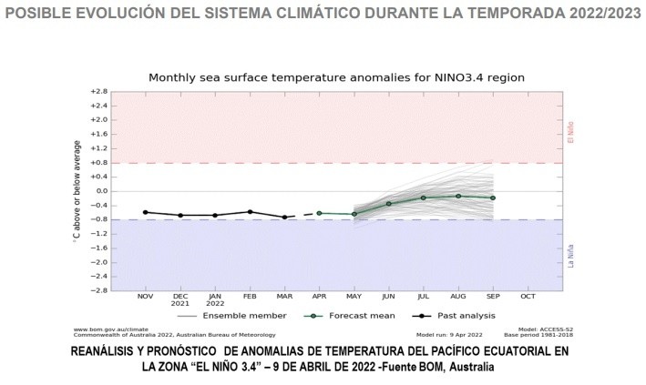 En cuanto a la cosecha gruesa 2022/2023, la mayoría de las perspectivas apunta a una evolución dentro del rango “Neutral Frío” con tendencia hacia un gradual calentamiento, que podría mejorar la situación.