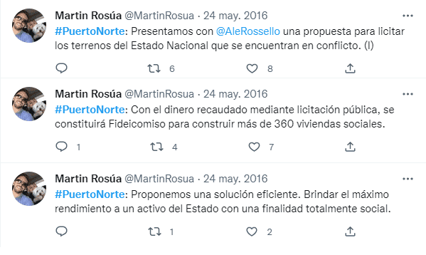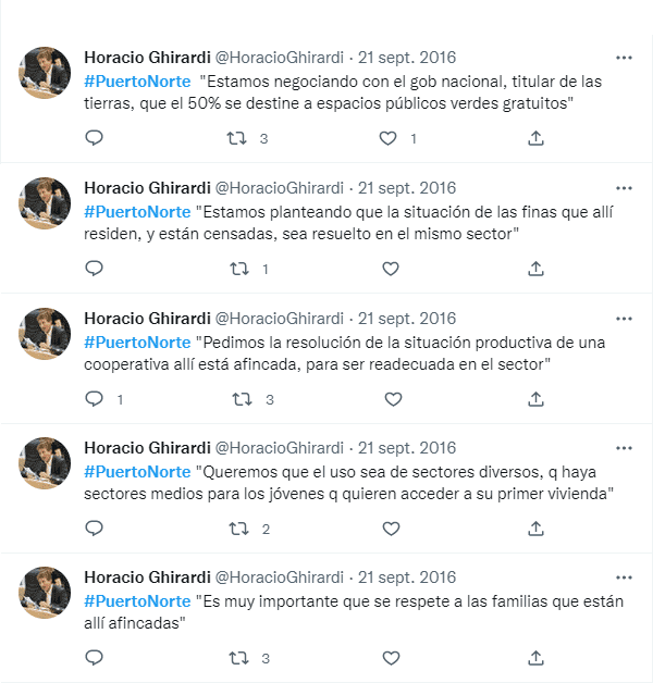 Ese mismo año el presidente de la Comisión de Planeamiento del Palacio Vasallo, Horacio Ghirardi, ingresó otro proyecto similar para la formulación del plan de detalle en los terrenos de Puerto Norte. El objetivo era que el Departamento Ejecutivo lo tuviera en cuenta a la hora de negociar el acuerdo con Nación priorizando un 50 por ciento para espacios públicos y equipamiento comunitario. El resto sería destinado a la realización de viviendas financiadas a través de planes nacionales, provinciales o municipales, apuntadas a sectores medios. “Planteamos que tenemos interés de que allí se produzca un proceso de urbanización con una mixtura de usos: una edificación en altura y solución para las familias allí afincadas, además de propuestas comerciales y de servicios”, había señalado.