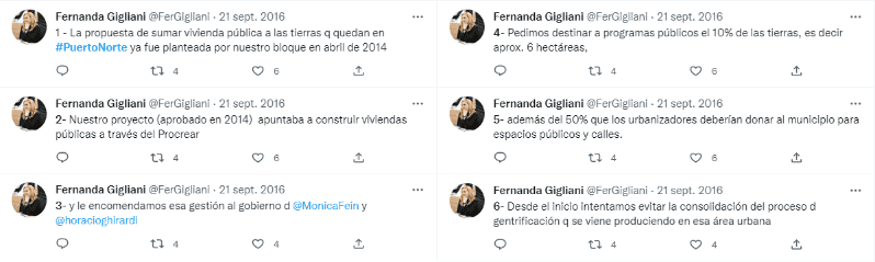 La concejala Fernanda Gigliani presentó en 2014 un proyecto que apuntaba a construir viviendas públicas a través del Plan Procrear. El 10 por ciento de las tierras eran destinadas a programas públicos, además del 50 por ciento que los urbanizadores deberían donar al municipio para espacios públicos y calles.