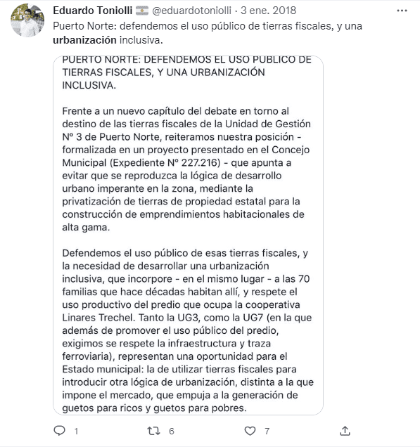 Dos años después el entonces concejal Eduardo Toniolli presentó otro proyecto solicitando que el Ejecutivo elabore un plan de urbanización para dicho predio, que incluya viviendas, servicios y regularización dominial para las familias que lo habitan. Su objetivo era que se incorpore y respetara a las familias en esa urbanización, generando las condiciones necesarias. “Es necesario detener el proceso de gentrificación, esto significa que las viviendas de este tradicional barrio obrero de la ciudad, sean reemplazadas por edificios de lujo destinados a la especulación inmobiliaria, o a viviendas de sectores de alto poder adquisitivo, desplazando a los tradicionales habitantes del barrio a la periferia de la ciudad”, había explicado en los considerandos.