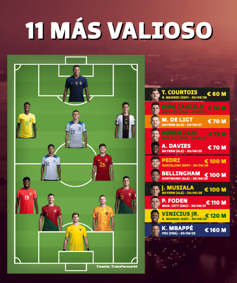 Como mediocampistas ofensivos figuran el alemán Jamal Musiala (100 millones de euros); el inglés Phil Foden (110 millones de euros); y el brasileño Vinicius Jr. (120 millones de euros)