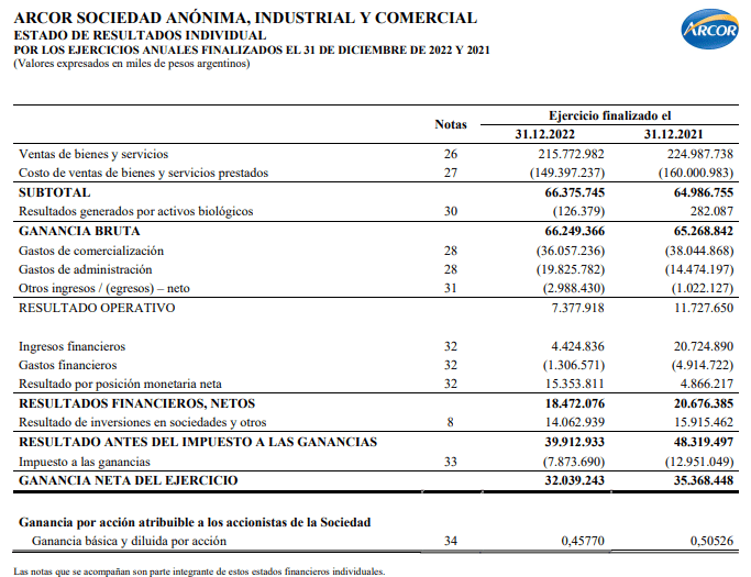 La contracara es Arcor. La industria de Arroyito tuvo una ganancia algo inferior en 2022 que en 2021. En el balance al 31 de diciembre pasado la empresa tuvo una ganancia neta de 32.039.243.000 pesos, mientras que un año antes ascendió a 35.368.448.000 pesos.