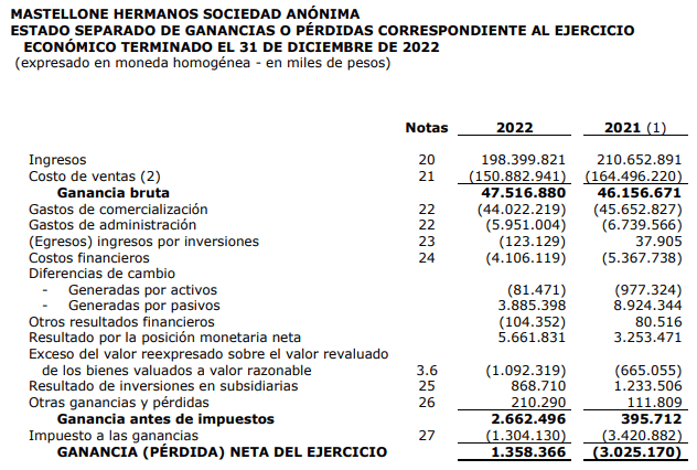 La firma Mastellone presentó un balance con una ganancia de 1.358.366.000 pesos en el período 2022, al 31 de diciembre. En contrapartida venía de un 2021 en el que había anunciado pérdidas por 3.025.170.000 pesos. Por tal motivo mostró una mejora del 144 por ciento, por encima de la inflación.