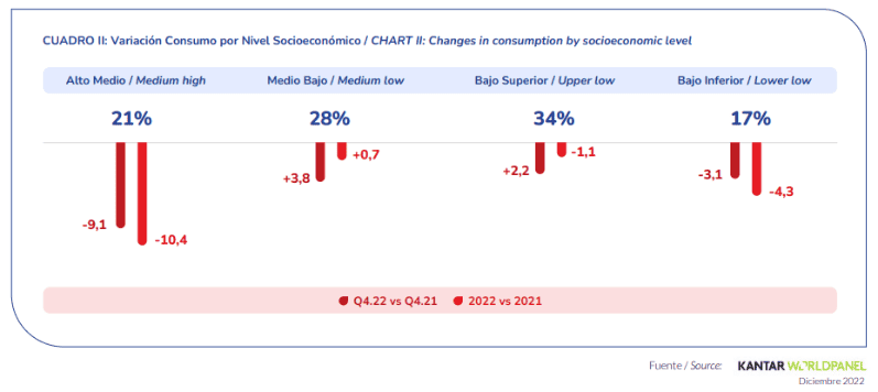 La propia firma indica en el balance: “El consumo masivo cerró el año con -3% y 8 de cada 10 categorías sufrieron caídas, incluso las necesarias y prescindibles. En términos de canales, el Hiper y Super continuó ganando relevancia, ofreciendo conveniencia y accesibilidad”. “Los extremos de la pirámide restringen consumo, con motivos dispares: la base se ajusta a su ingreso disponible (-4,3%) y la cima relega el consumo dentro del hogar (-10,4%)”, agregan.