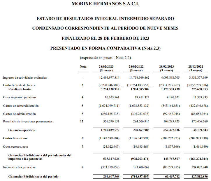 En el primero de ellos, Morixe registró una caída en el ingreso de actividades ordinarias frente a 2021. Pero fue aún mayor la baja en el costo de las ventas. Así obtuvo un resultado bruto de 3.294.130.912 pesos frente un antecedente de 1.994.385.909 pesos.