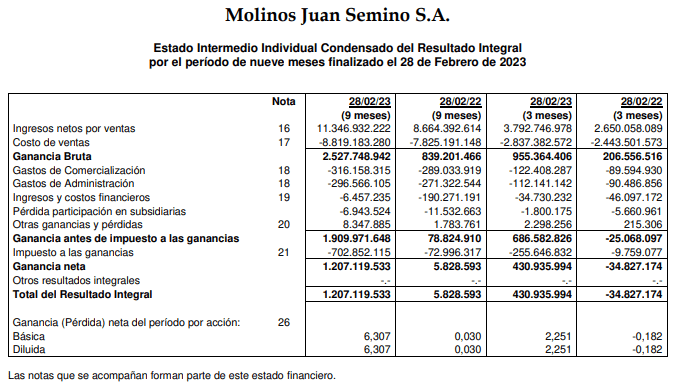 Molinos Juan Semino S.A., de Carcarañá, informó por su parte una ganancia de 1.207.119.533 pesos por el período de nueve meses finalizado el 28 de febrero de 2023. El año anterior fue de solo 5.828.593 pesos, por lo que presenta un muy fuerte crecimiento por encima de la inflación.