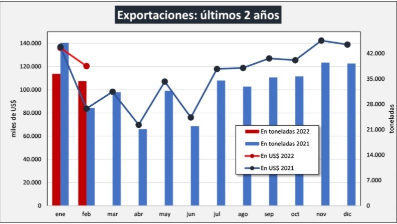 Las exportaciones de enero y febrero 2022 se han realizado en su mayoría con mercadería que estaba en stock debido a la acumulación del mismo por las dificultades que se fueron dando en el transcurso de 2021 (principalmente baja disponibilidad de contenedores en particular y de logística en general).
