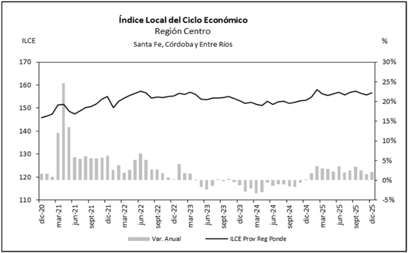 La economía de la Región Centro registró un crecimiento del 2,5% en 2025, aunque aún se mantiene por debajo del promedio nacional, según el último informe de Indicadores Económicos Regionales de la Universidad Austral. El dato surge del Índice Local del Ciclo Económico (ILCE), que mostró una variación interanual de 2,1% a diciembre.
