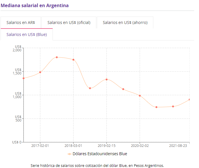 No sucede lo mismo cuando se evalúa la progresión de los salarios medido en dólar blue a lo largo de estos últimos años. Mientras que en el 2017 la media era de u$s 1356,18, hoy es de u$s 905,23.