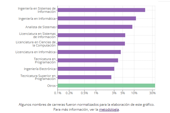 En cuanto a las carreras más elegidas dentro del sector IT se ubica en primer lugar Ingeniería en Sistemas de la Información, seguida de cerca por Ingeniería en Informática y en tercer lugar Analista de Sistemas.