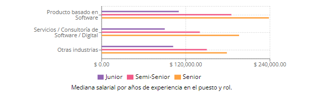 En el siguiente gráfico se evidencia una diferencia en los niveles de salarios que manejan las empresas de Producto basado en software respecto de las otras. En segundo lugar, y muy cercano al siguiente, quienes trabajan en áreas de Sistemas dando soporte a Otras Industrias. Por último, Servicios / Consultoría de Software / Digital.