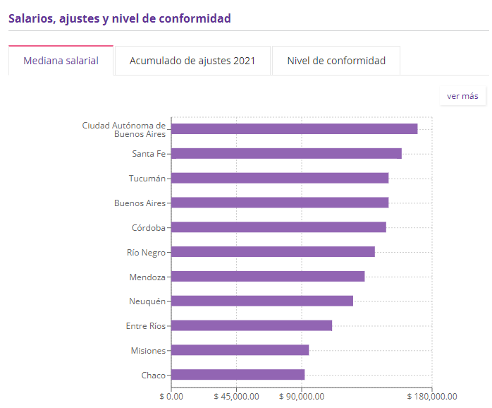 En cuanto a los niveles de educación formal, el sueldo promedio para los trabajadores que cuentan solamente con el secundario completado es de $132 mil, mientas que para los que estudiaron un terciario en tecnología es de $140 mil y para los que terminaron carreras universitarias de $163 mil. Para aquellos que cuentan con un doctorado el promedio de sueldo es de $195 mil y para lo que acreditan un posgrado realizado de $210 mil.