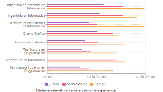 En cuanto a los salarios percibidos según las carreras estudiadas, Sysarmy solo contó a los participantes que las completaron. En este sentido, la carrera que mejores resultados arroja en cuanto a dinero para un puesto Junio, Semi-Senior y Senior son en primer lugar Ingeniería en Sistemas de la Información, seguida por Ingeniería en Informática y en tercer lugar la Licenciatura en Sistemas de Información.