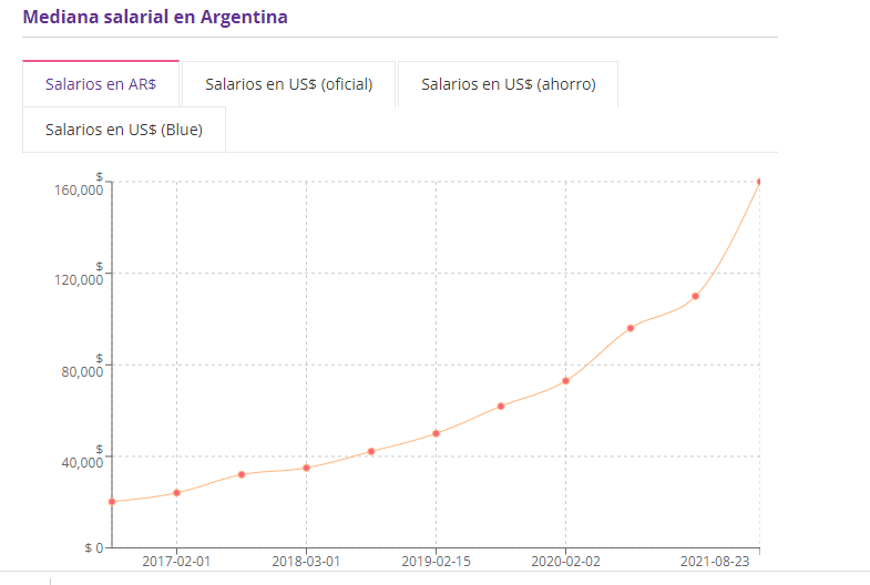 En el gráfico elaborado por Sysarmy para dar cuenta de la evolución de los salarios en la industria tecnológica, se puede visualizar cómo escalaron los sueldos con el pasar de los meses. En la actualidad, de acuerdo a la misma fuente, la mediana salarial del sector es $160.000, $50.000 más alto que la encuesta anterior.