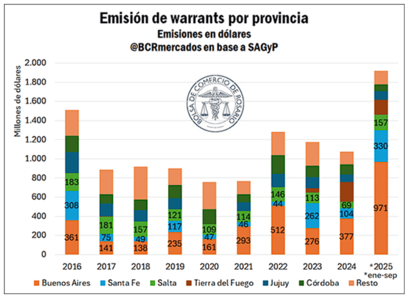 La Secretaría de Agricultura, Ganadería y Pesca del Ministerio de Economía de la Nación informa que, entre enero y octubre de 2025, se emitieron warrants en dólares por 1.960 millones y en pesos por 159.161 millones, mientras que para el mismo período de 2024 las emisiones en dólares habían sido de 965 millones y en pesos de 94.188 millones. Esto representa un aumento interanual del 102% en dólares y de un 69% en pesos, según información procesada por la Subsecretaría de Mercados Agroalimentarios e Inserción Internacional.