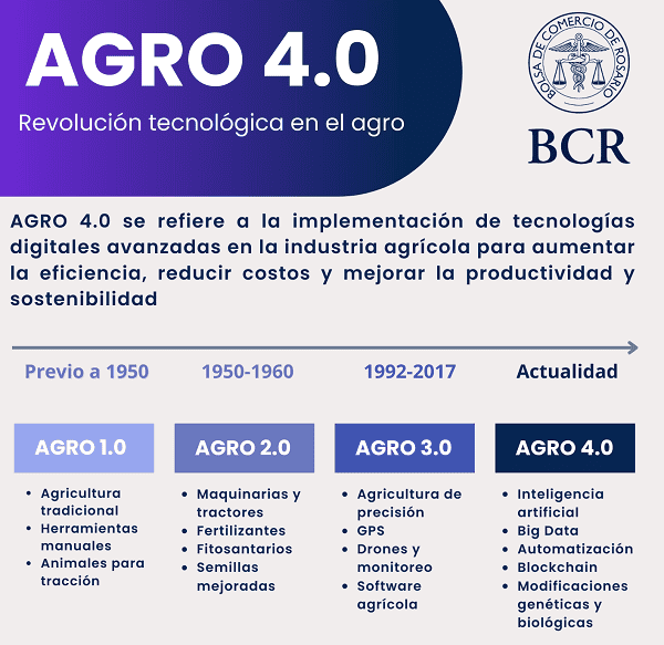 Los procesos de producción han evolucionado en el tiempo y actualmente se observa la 4° revolución industrial del sector agroalimentario, denominado “AGRO 4.0”. Este concepto incluye la integración de tecnologías avanzadas tales como la inteligencia artificial, Blockchain, Big Data, robots y maquinaria automática, manipulación genética y biológica, entre otros. "La implementación de estas tecnologías en el agro permite una mayor eficiencia y productividad, una mejor gestión de los recursos naturales y sostenibilidad ambiental", indicaron las expertas de la BCR, Emilce Terré y Natalia Marín.